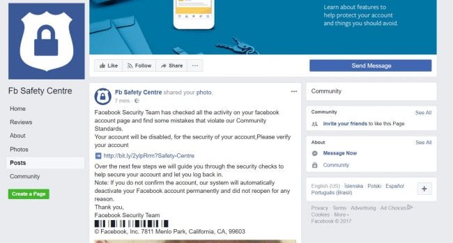 Svindlið virkar þannig að þú færð tilkynningu um að FB Safety Centre hafi deilt myndinni þinni. Þú ýtir á það og sérð að FB Safety Centre deilir myndinni þinni og skrifar að þú verðir að staðfesta facebook-aðganginn þinn innan 24 klukkustunda, annars verði honum lokað og þú getir aldrei opnað hann aftur.