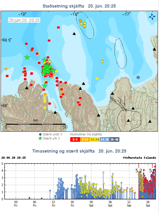 Þar kemur einnig fram að heildarfjöldi jarðskjálfta á svæðinu það sem af er nálgast núna 800 þar af eru 56 stærri en M3.