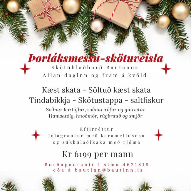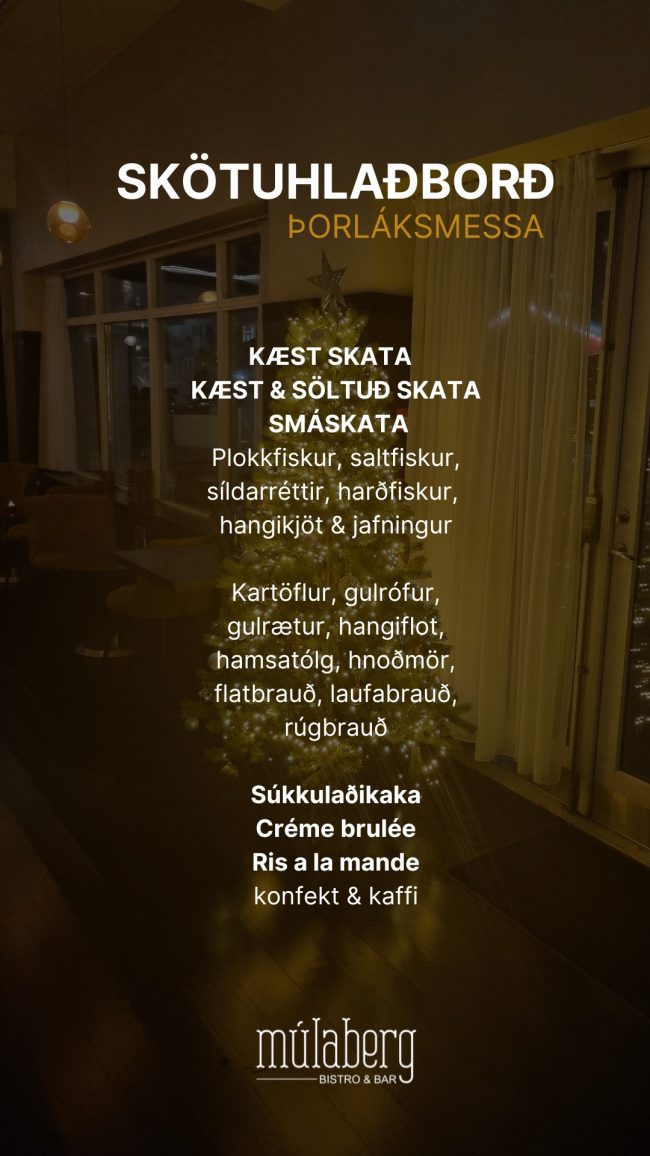 Þegar þessi frétt er skrifuð eru örfá sæti laus í skötuhlaðborð á Múlabergi klukkan 13:30 á Þorláksmessu. Hver fer þó að verða síðastur að tryggja sér borð! Bókanir í síma: 460-2020