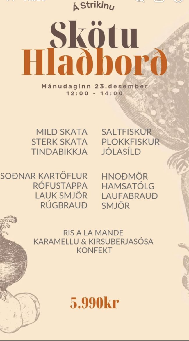 Skötuhlaðborð verður á Strikinu í hádeginu á Þorláksmessu, frá 12:00 til 14:00. Hægt er að bóka borð í síma eða á strikid.is