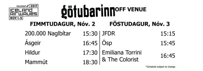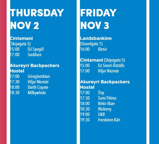 Akureyri er nú hluti af Iceland Airwaves en vegleg dagskrá verður bæði á fimmtudag og föstudag hér fyrir norðan. Tónleikarnir fara allir fram í Hofi, á Græna hattinum og Pósthúsbarnum. Þeir sem ekki eiga miða á Airwaves þurfa þó ekki að örvænta þar sem að fjölmargir tónleikar verða í boði off-venue hjá Backpackers, Landsbankanum og í verslun Cintamani. Einnig verður off-venue dagskrá í boði á Götubarnum og Iceland Air hóteli Akureyrar.