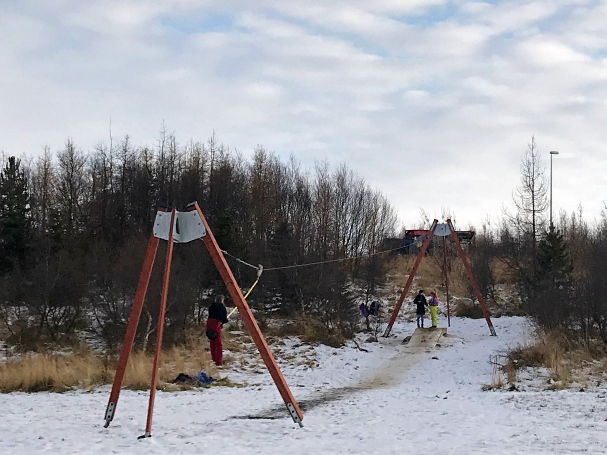 Hverfisnefnd Lunda- og Gerðahverfis á Akureyri festi kaup á Aparólu á síðasta ári og nú hefur henni verið komið upp við Jólasveinabrekkuna við Brálund.