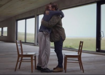 Íslendingur og flóttamaður faðmast. Skjáskot úr myndskeiðinu.
