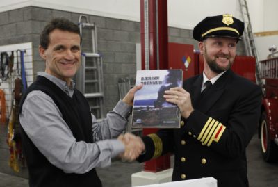 Á miðvikudag var var efnt til samkomu í Slökkvistöðinni á Akureyri þar sem Jón Hjaltason sagnfræðingur afhenti Ólafi Stefánssyni slökkvistjóra fyrsta eintakið af nýrri bók sinni um stórbruna í sögu bæjarins.