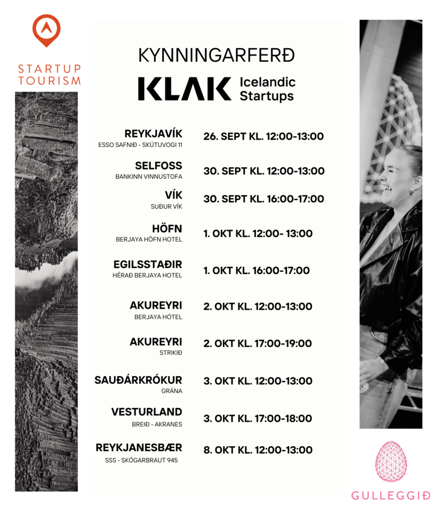 Félagið KLAK – Icelandic Startups er í kynningarferð um landið eins og er og heldur kynningarfundi á Akureyri á morgun, miðvikudaginn 2. október. Kynningarfundur um viðskiptahraðalinn Startup Tourism verður haldinn kl. 12:00 á morgun á Berjaya hótelinu en kynningarfundur um frumkvöðlakepnnina Gulleggið á Strikinu kl. 17:00.