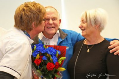 Benedikt fékk kossa og blóm í þakklætisskyni. Mynd: 640.is
