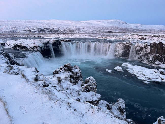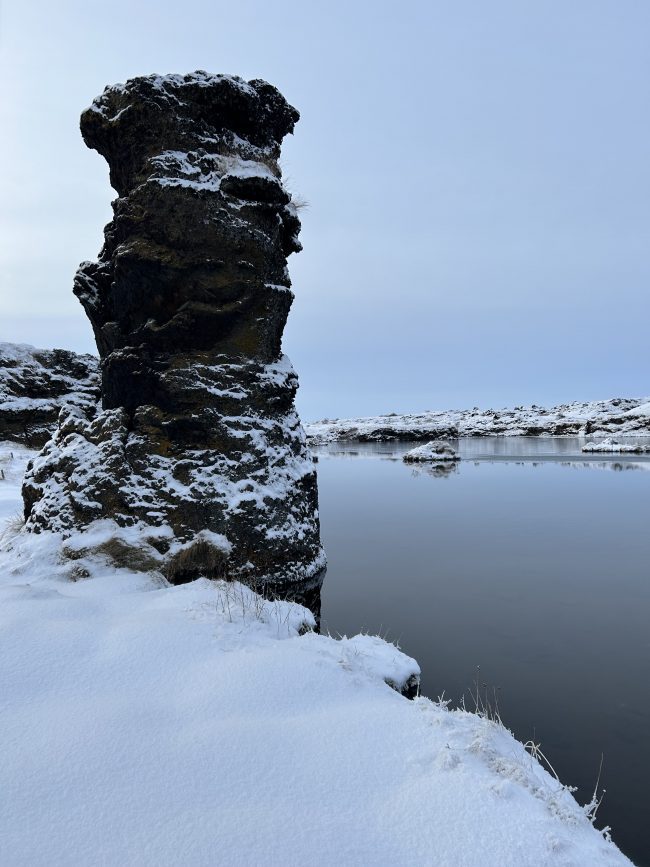 Aftur er leiðinni haldið austur fyrir heiði. Hér er vissulega val á milli Vaðlaheiðarganga og Víkurskarðs en miðað við veður eru göngin hugsanlega betri kostur. Sniðugt er að leggja af stað um 10 leytið, því við förum ekki sérstaklega hratt yfir í færð sem þessari og það skiptir svolitlu máli að vera kominn að Dimmuborgum klukkan 12. Við fylgjum þjóðvegi eitt alla leið að Mývatnssveit en keyrum svo sunnan við vatn að Skútustöðum til þess að virða fyrir okkur fyrsta áfangastaðinn á rúntinum þessa vikuna, sem við komum að eftir um klukkutíma keyrslu. Að sjálfsögðu keyrum við fram hjá Goðafossi á leiðinni, svo þeir sem ekki virtu hann fyrir sér nýlega geta lengt ferðina eilítið og farið að skoða hann, hann er afskaplega fallegur í vetrarbúningnum.