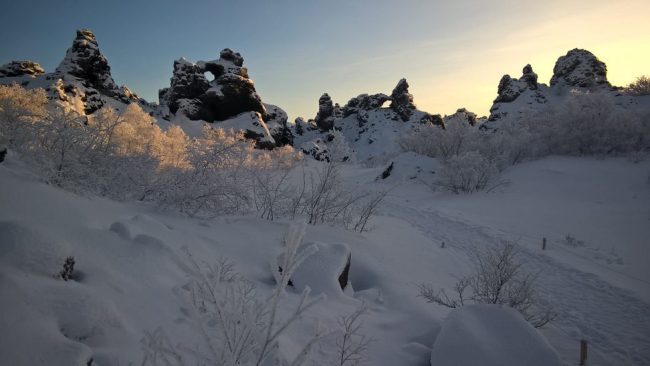 Þegar við komum að Dimmuborgum getum við gengið þar um eins lengi og okkur sýnist. Hafa ber í huga að kaffihúsið hér, Kaffi Borgir, lokar klukkan 14:00 yfir vetrartímann, svo það er góð hugmynd að sækja sér kaffibollann áður en gengið er af stað.
