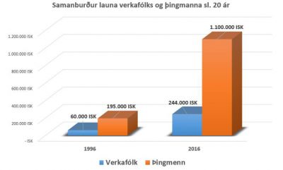 Á þessari mynd sést launaþróun þingmanna og verkafólks á lægstu töxtum á Íslandi síðustu 20 ár, en þar kemur fram að þingfararkaup hefur hækkað um 905 þúsund krónur á mánuði á þessu tímabili eða sem nemur 464%. En á sama tímabili hefur lægsti taxti verkafólks hækkað einungis um 184 þúsund krónur á mánuði, eða sem nemur 306%.