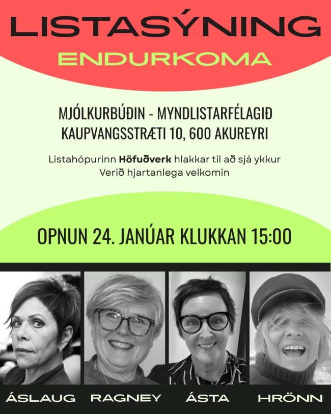 Listhópurinn Höfuðverk samanstendur af sjö listakonum sem voru samferða í gegnum myndlistaskóla og hafa þær haldið saman nokkrar samsýninga gegnum árin. Þær munu nú halda sýning sem ber nafnið Endurkoma og verður opnun í sal Myndlistafélagsins laugardaginn 24. janúar kl. 15:00.