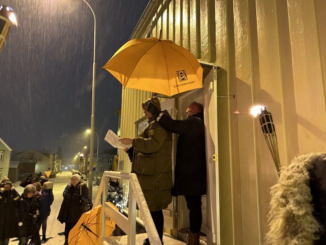 Þurfti aðstoðarmanneskju til að halda ræðu Huldu þurri á meðan á ávarpinu stóð, enda snjóaði hressilega.