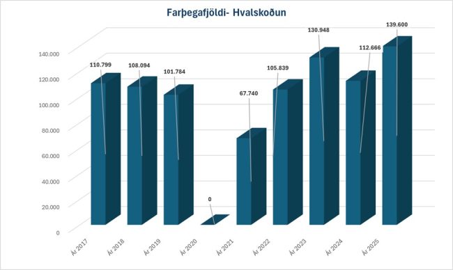 Árið 2025 var stærsta ár hvalaskoðunar á Húsavík frá upphafi. Þetta kemur fram á vef Norðurþings. Um 140 þúsund farþegar fóru í skoðunarferðir, sem er 24% aukning milli ára og slær við fyrra meti frá 2023. Fjögur fyrirtæki buðu upp á ferðir á árinu. Samhliða fjölgun ferðamanna hefur Hafnasjóður Norðurþings lagt í verulegar framkvæmdir til að bæta aðstöðu og upplifun gesta við höfnina.