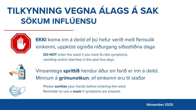 Ef þið eruð með einkenni öndunarfærasýkingar (inflúensu eða umgangspesta) skal fresta heimsókn.