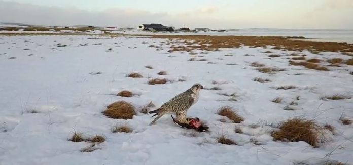 Magnús Skarphéðinsson bóndi í Svartárkoti í Bárðardal náði á dögunum mögnuðu myndskeiði af fálka sem var að gæða sér á húsandarstegg skammt frá Svatrárkoti í Bárðardal.