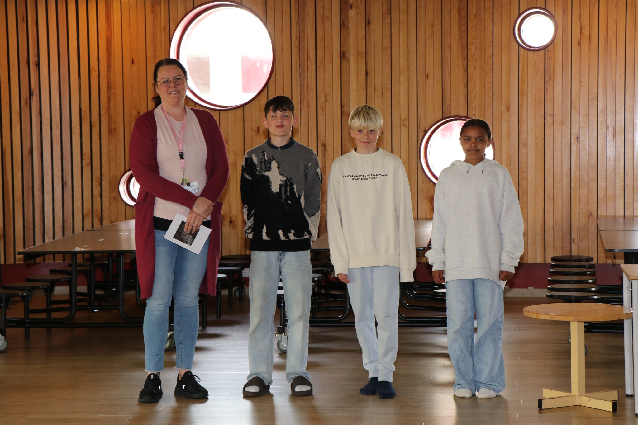 Á sviðinu við afhendinguna stóðu fulltrúar bekkjanna þriggja ásamt Hafdísi Maríu Tryggvadóttur kennara. Með gjöfinni fylgdi fallegt kort þar sem stóð: