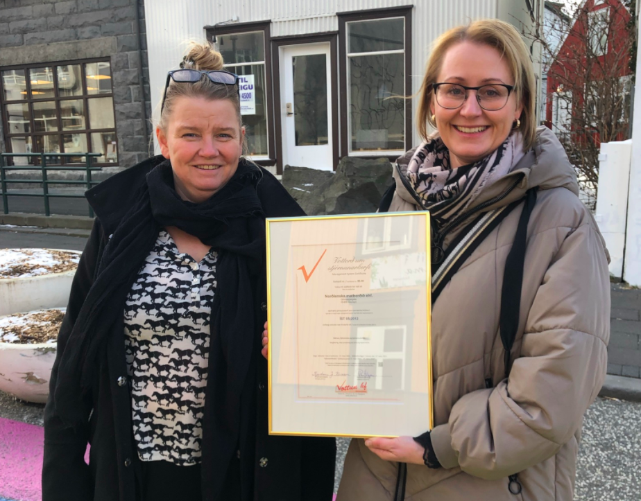 Það var Jóna Jónsdóttir starfsmannastjóri Norðlenska (t.h.) sem veitti jafnlaunavottuninni viðtöku en hún ber jafnframt ábyrgð á innleiðingu og viðhaldi jafnlaunastjórnunarkerfis fyrirtækisins. Með henni á myndinni er Stefanía G. Kristinsdóttir frá Vottun hf. (t.v.)