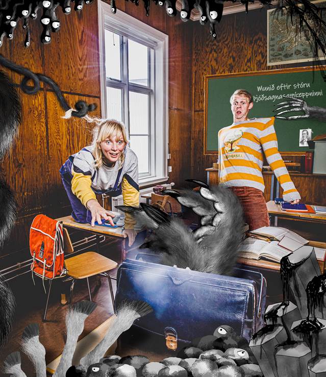 Um hvað fjallar sýningin? „Í Hringvallaskóla opnast fyrir algjöra slysni gátt inn í heim íslenskra þjóðsagna. Saklausum sjöundabekking, Jóni Árnasyni er í kjölfarið rænt af Húmskollunni skelfilegu svo bekkjarsystkini hans Sóley og Bjartur leggja upp í háskaför honum til bjargar. Við tekur æsispennandi atburðarás þar sem hinar ýmsu kynjaverur íslenskra þjóðsagna koma fyrir, Nykur, Skoffín og Skuggabaldur ásamt fleirum. Ná þau að bjarga Jóni Árnasyni? Er Nykrinum treystandi? Hver á augun í myrkrinu? Hver er þessi Húmskolla? Er einhver leið að komast lifandi aftur til mannheima?”