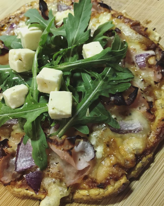 Pizzan er þá aftur sett inn í ofn í ca 5-10 mín í viðbót á sama hita þar til osturinn hefur bráðnað og fengið fallegan lit og svo tekið út og bætt við klettasalati og fetaosti. Einnig er hægt að nota til dæmis avocado, spínat og/eða tómata sem ferskt álegg.