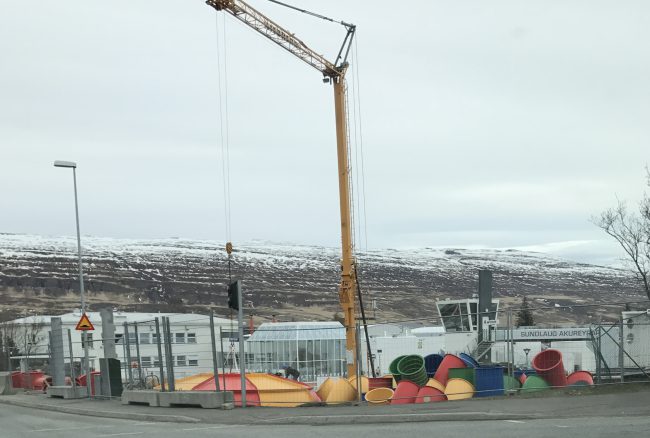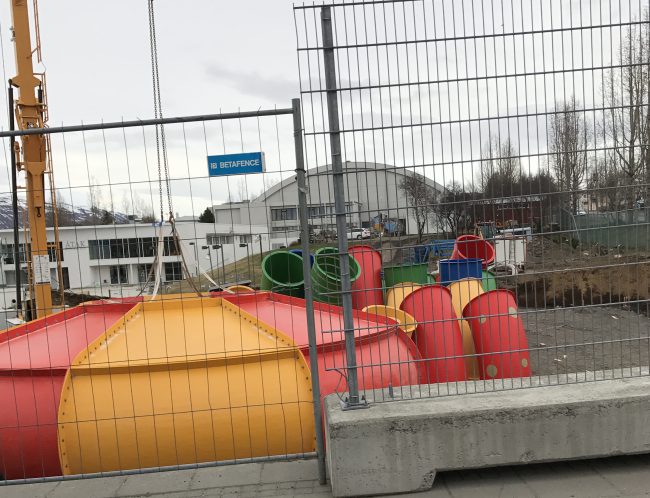 Framkvæmdir hafa staðið yfir síðan í október á síðasta ári en stefnt er að því að nýjar rennibrautir verði vígðar í júnímánuði. Eins og sjá má á myndum eru rennibrautirnar komnar inn á svæði sundlaugarinnar og verður farið í að setja þær upp á næstunni.
