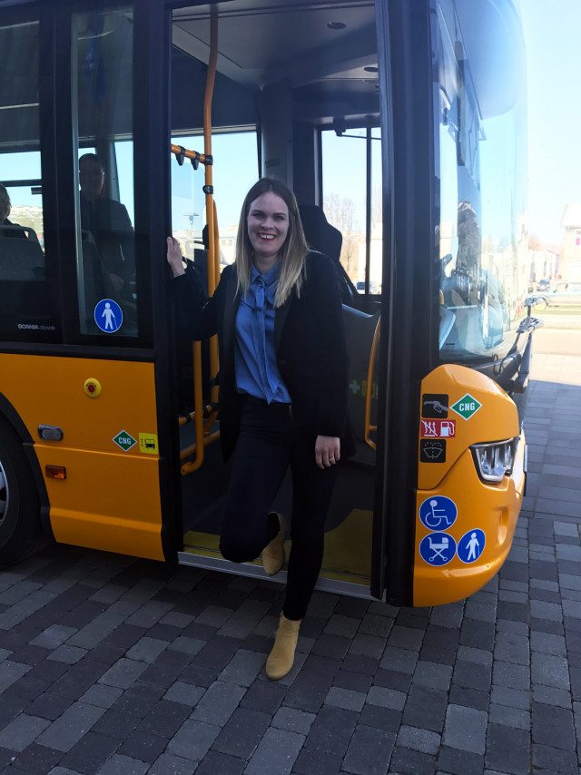 Björt Ólafsdóttir umhverfis- og auðlindaráðherra skoðar nýjan metanstrætó Akureyrarbæjar.