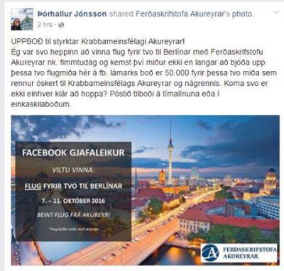 Ferðaskrifstofa Akureyrar efndi til leiks á Facebook þar sem vinningurinn var flug fyrir 2 til Berlín.