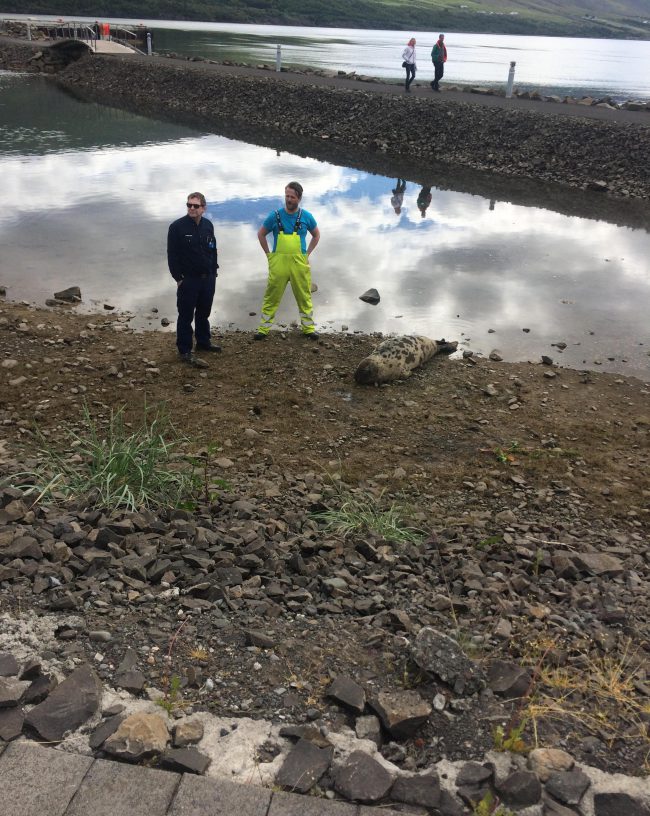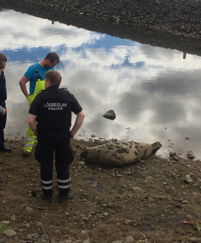 Nú er selurinn kominn upp á bakkann og virðist lítið geta hreyft sig. Lögreglan er á staðnum og beðið er eftir Dýraeftirlitinu til að hafa afskipti af selnum sem virðist sárkvalinn. Hann kastar upp olíu og er það líklega ástæða þess að hann er jafn veikur og raun ber vitni.