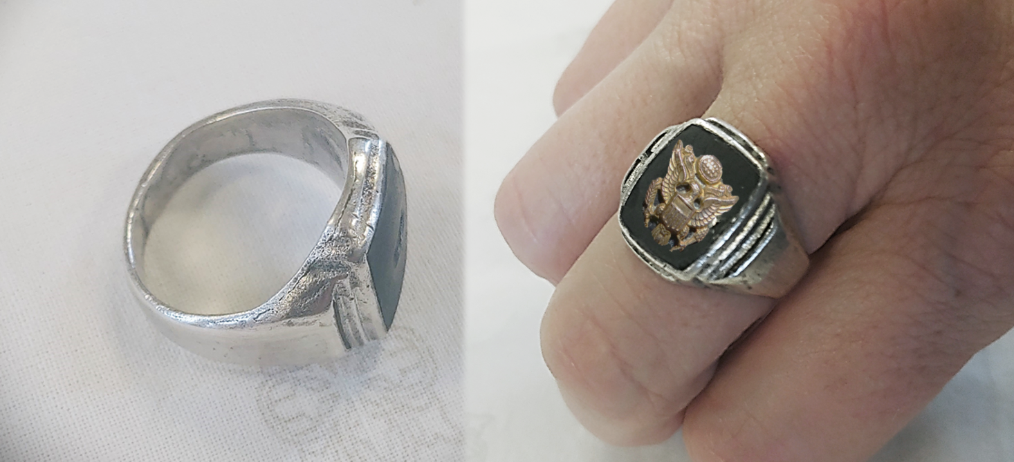 Flöturinn á hringnum er úr svörtum glerungi og til hliðar við hann á langhliðum eru svartar skrautlínur. Í glerungnum er rás þar sem áður var áfstur gylltur örn. Glansandi svartur flöturinn með gyllingu hefur því líkast til skinið skært á stríðsárunum. Í dag er glerungurinn máður og gylltur örninn floginn burt. Silfrið í hringnum sjálfum skín hins vegar jafn skært í dag og þegar setuliðsmaður á Akureyri, líklega liðforingi í ameríska hernum, gekk með hann fyrir 80 árum síðan. Á heimasíðum erlendra safnara má sjá að hringar sem þessi eru ekki á hverju strái.
