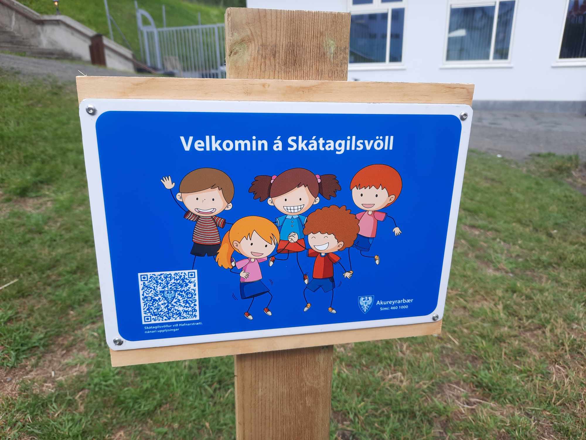 Nýlega vakti Sævar Þór Halldórsson, stjórnandi Facebook-hópsins „Áhugafólk um skilti“, athygli á skilti sem stendur við Skátagilsvöll. Sævar veltir því fyrir sér hvern skiltið sé gert fyrir en á skiltinu stendur nafn leikvallarins og eru teikningar af börnum ásamt QR-kóða. Ef fylgt er kóðanum þá færðu upp pdf-skjal þar sem upplýsingar eru að finna um hvert tæki á leikvellinum, fyrir hvaða aldurshóp leiktækið sé, ábyrgðaraðila (símanúmer hans í einhverjum tilvikum) og vottun tækisins. Efst í skjalinu er síðan hlekkur til þess að senda ábendingar á Akureyrarbæ ef eitthvað er ábótavant varðandi leikvöllinn. Athugasemd var gerð við færsluna þar sem sagt var að allir leikvellir bæjarins væru með þessar merkingar, meðlimir Facebook-hópsins velta fyrir sér „hráu útliti“ pdf-skjalsins og tilvist skiltanna. Hægt er að sjá skjalið frá Skátagilsvelli hér að neðan.