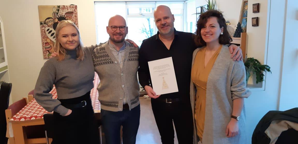 Fulltrúar frá R5 og nemendur úr Tónlistarskólanum á Akureyri afhentu styrkinn núna í janúar ásamt því að spila og syngja fyrir gesti Lautarinnar við afhendinguna.