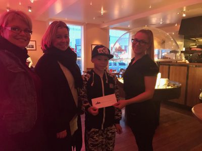 Á myndinni sést Freydís Ásmundsdóttir, starfsmaður Bautans, afhenda fulltrúum Hetjanna peninginn fyrir hönd starfsmanna Bautans.