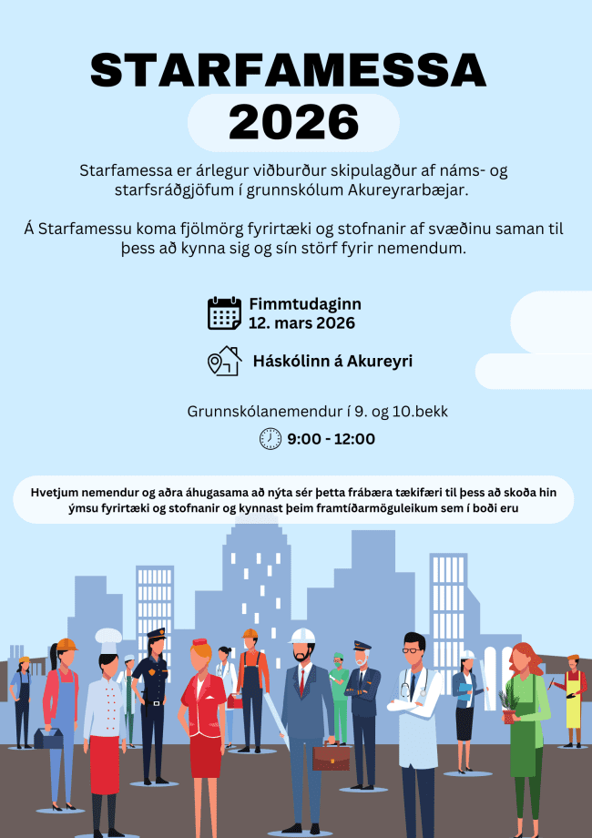 Starfamessa er haldin í áttunda sinn af náms- og starfsráðgjöfum í grunnskólum á Akureyri í samstarfi við HA og SSNE. Messan verður haldin þann 12. mars í húsakynnum HA. Markmiðið með starfamessunni er að kynna fjölbreytt störf þar sem nemendur fá tækifæri til að auka víðsýni hvað varðar framtíðarmöguleika. Um það bil 800 nemendur á Norð- Austurlandi sækja viðburðinn en einnig er tilvalið fyrir aðra áhugasama að nýta sér tækifærið að kynna sér fjölbreytt fyrirtæki og störf.