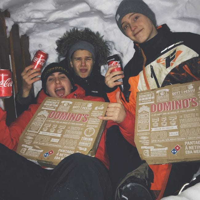 „Fyrst átti þetta bara að vera venjulegt snjóhús en við ákváðum síðan að breyta því í pizza stað og fengum gesti af snappinu til að kíkja í slæsu. Næsta dag veltum við því fyrir okkur hvort að það væri ekki hægt að nýta það í eitthvað annað, þá settum við upp flatskjá og playstation tölvu inn í húsinu og tókum einn FIFA leik, maður er víst aldrei of gamall til að fara út að leika sér,“ segir Gísli Máni einn af meðlimum í Miðjunni.