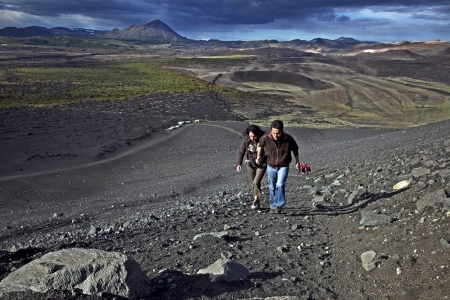 Ferðamenn ganga eftir merktum göngustíg á Hverfjalli.