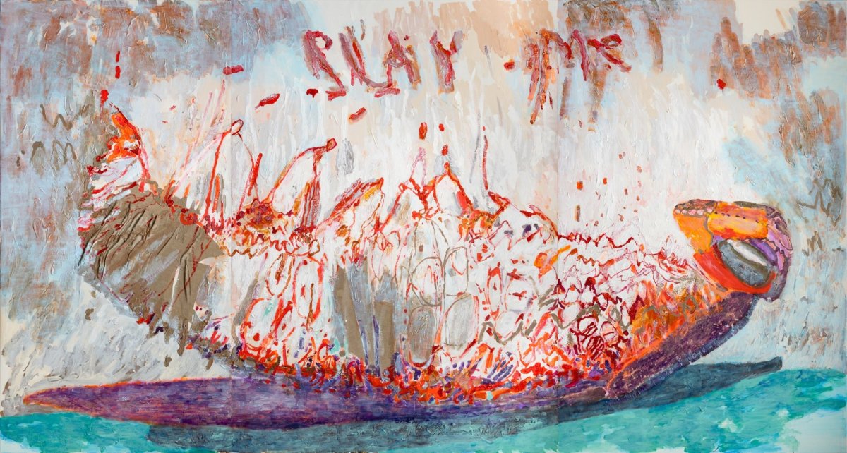„Djarfar og kröftugar pensilstrokur bera ekki vitni um hvatvísi í risastórum málverkunum, heldur birtast villtar og goðsagnakenndar skepnur upp úr löngu og meðvituðu ferli – hvort sem það er páfugl með „strap-on“ eða skordýr í trylltum hlátri,“ segir bandaríski listfræðingurinn Pavi Stave um sýningu Guðnýjar Kristmannsdóttur. „Þykk upphleðsla lita, þunnar málningastrokur og hrár grunnur á yfirborði málverksins skapa kraftmiklar en yfirvegaðar hliðstæður sem blása lífi í skepnurnar. Skapandi og hrekkjótt; gleði þeirra er smitandi. Play Me – Kveikja er titill eins verksins. Athugið að þér er ekki endilega boðið til leiks, heldur er verið að lokka þig til þess að gefa lausan tauminn og ganga inn í heim nautnalegrar gleði listamannsins.