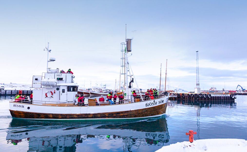Fyrsta hvalaskoðunarferð ársins á Skjálfanda var farin í gær þegar báturinn Bjössi Sör hélt út á flóann með tuttugu farþega um borð. Það var blíðskaparveður og falleg vetrarstilla á Húsavík og aðstæður hinar bestu til siglinga.