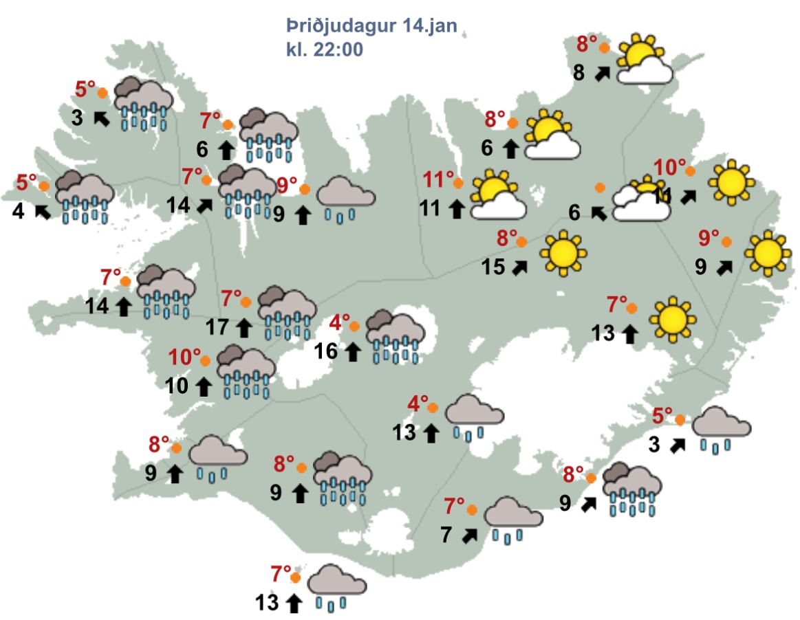 Talsvert hlýviðri hefur verið víða um land síðustu daga með tilheyrandi hláku og leysingum. Þessi hlýindakafli nær ákveðnum hápunkti á Akureyri í dag, þriðjudaginn 14. janúar. Samkvæmt spá Veðurstofunnar mun hlýna eftir því sem líður á daginn og spáir ellefu stiga hita klukkan tíu í kvöld.