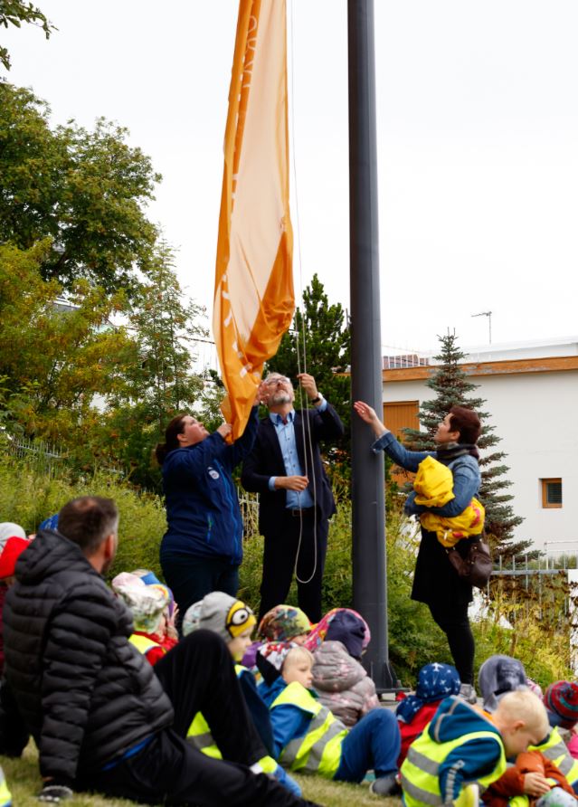 Eiríkur ásamt Ólöfu, leikskólakennara og skáta, við setningu Akureyrarvöku og Afmælishátíðar Akureyrarbæjar 2017. Krakkar úr tveimur leikskólum komu saman og sungu meðan Akureyrarvökufánanum var flaggað.
