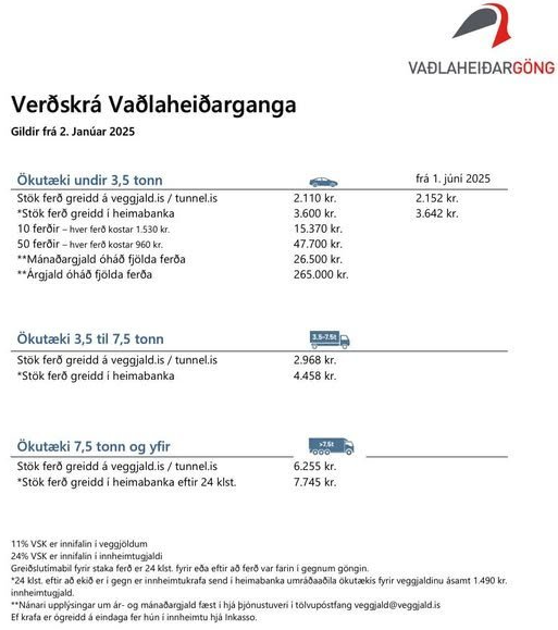 Frá og með 2. janúar 2025 mun ný verðskrá taka gildi fyrir veggjöld í Vaðlaheiðargöngum. Veggjalds hækkunin nemur 6% á alla greiðsluflokka og er í samræmi við almenna verðlagsþróun á síðasta ári eins og kveðið er á um í lánasamningi. Boðið verður upp á þá nýjung að bjóða til reynslu árgjald gegn staðgreiðslu óháð umferð en nú þegar er boðið upp á mánaðargjald fyrir fast ökutæki. Þetta kemur fram á veggjald.is.
