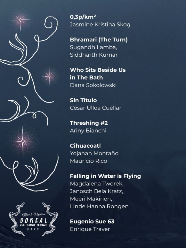 Samstarfs- og styrktaraðilar Boreal Screendance Festival 2025 eru: Akureyrarbær, KEA, Uppbyggingarsjóður Norðurlands eystra, Gilfélagið & Listasafnið á Akureyri.