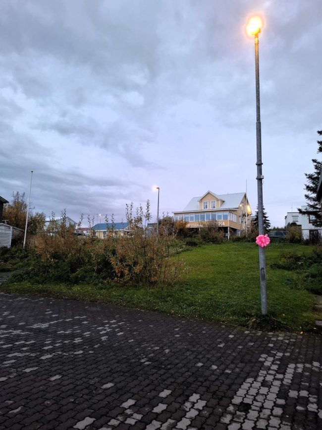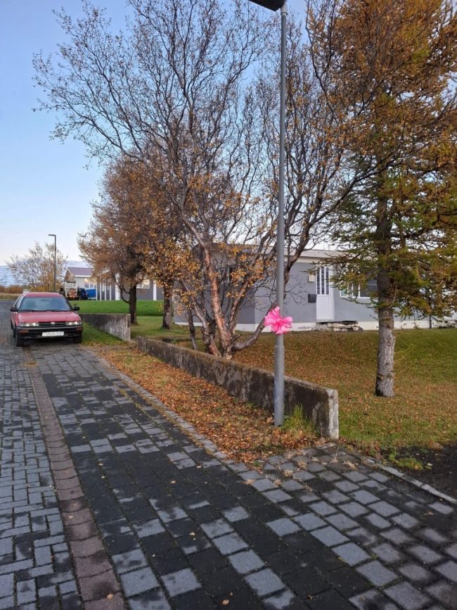 Í gær blöstu svo bleikar slaufur við Hríseyingum sem kvenfélagskonur voru búnar að hengja á ljósastaura víðsvegar um þorpið. Slaufurnar eru seldar í Centro á Akureyri og rennur upphæðin óskipt til Krabbameinsfélags Akureyrar og nágrennis.